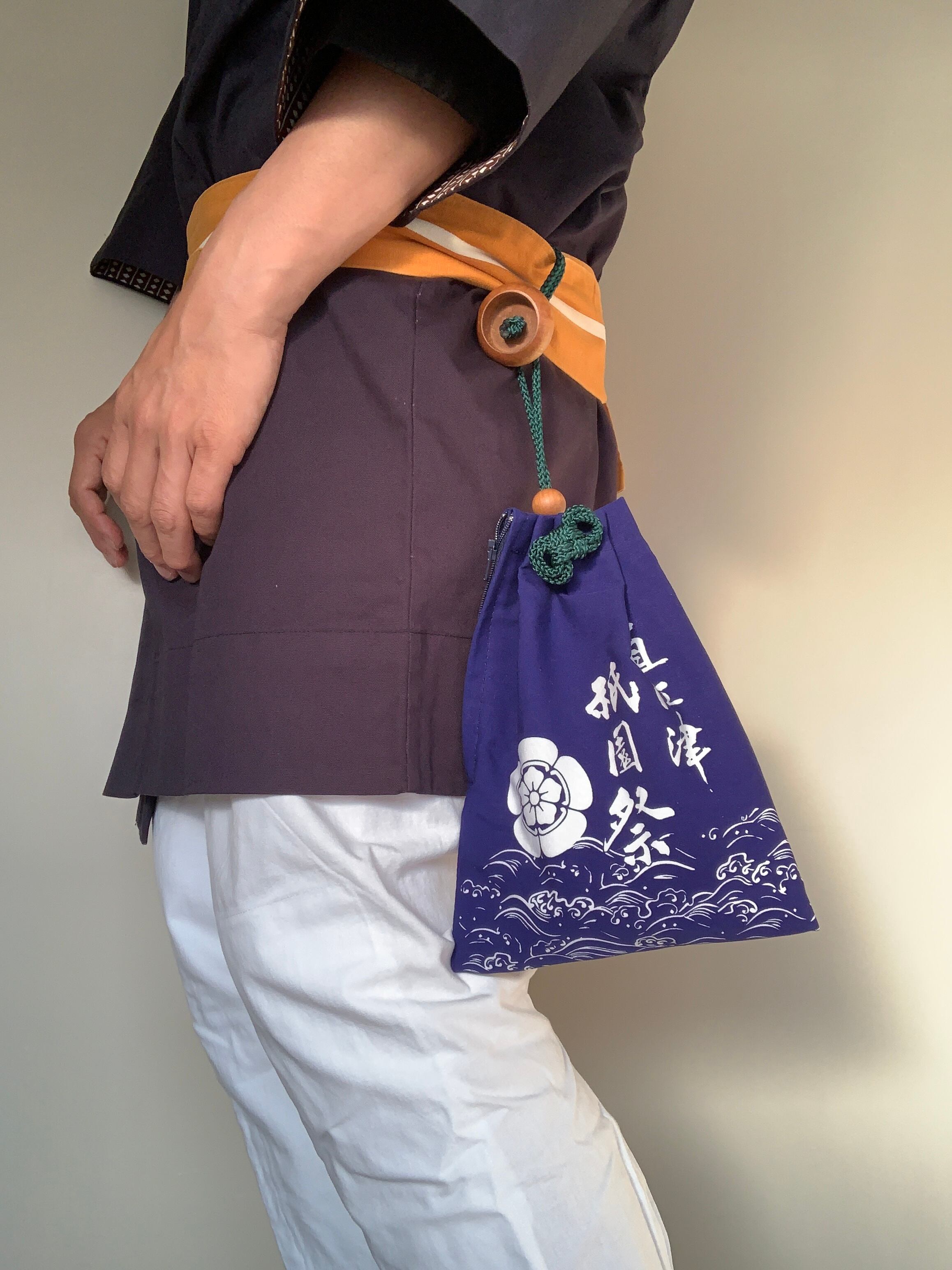 半纏や浴衣帯に根付でとめて腰から下げる巾着です。